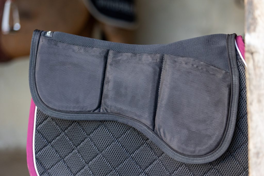 Les amortisseurs à cales se sont de plus en plus développés ces dernières années. Ils permettent plus de confort grâce à un meilleur ajustement possible en fonction de chaque cheval et de l’évolution de sa musculature. Depuis quelques semaines, nous testons l’amortisseur à cales 3D mesh velour de Pro-Confort.