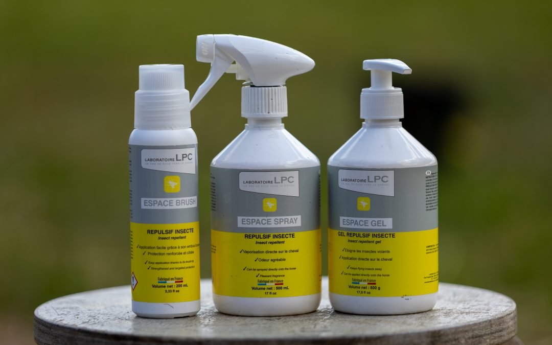 Avec l’été et le soleil arrivent forcément les mouches, taons, et autres insectes volants qui viennent “embêter” nos chevaux, au travail comme au pré. On cherche donc toujours le produit qui nous (et leur) simplifiera la vie pendant l’été. Depuis quelques semaines, nous testons l’Espace gel, l’Espace spray et l’Espace brush du Laboratoire LPC.