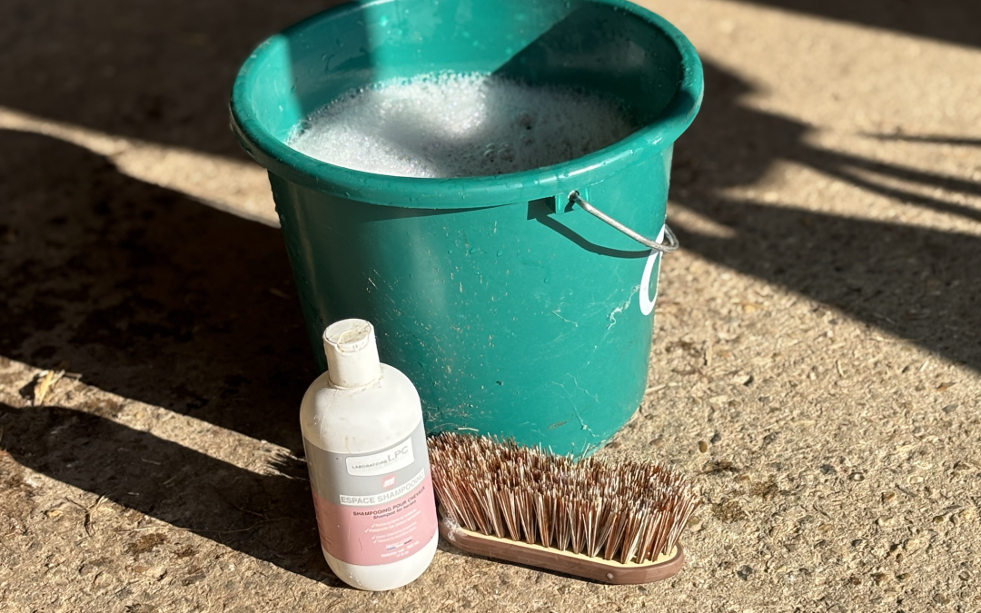 Ma jument revenant de plusieurs semaines de vacances au pré, je suis bien obligée d’admettre qu’elle avait une certaine quantité de terre et de poussière incrustées dans les poils. Plus je la brossais, plus j’avais l’impression qu’elle était sale. Il était temps vraiment temps de la shampouiner ! Comme conseillée, j’ai mis 3 bouchons dans un seau d’eau. Vu l’état de ma jument, j’ai choisi de frotter non pas à l’éponge mais avec un bouchon, en insistant bien, pour bien décoller toute la poussière. Ma jument a clairement apprécié le massage / décrassage. J’ai laissé agir quelques minutes, puis j’ai rincé et j’ai recommencé (mais cette fois-ci, juste plus grossièrement). Après un dernier rinçage, j’ai passé le couteau de chaleur puis j’ai été faire sécher la jument en la laissant brouter à l’ombre évidemment (la photo d’illustration a juste été faite au soleil avant de se décaler à l’ombre d’un arbre).