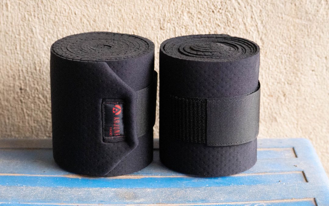 L’utilisation de bandes plutôt que de protections pour le travail dépend de différents critères. Que ce soit pour mettre à cause d’irritation ou de besoin de “soutien” des tendons, différentes bandes existent sur le marché. On connaît tous les habituelles bandes de polo en polaire ou encore les bandes de travail élastiques, mais cette semaine, nous avons testé une autre sorte de bandes, les bandes Néo (en néoprène) de Arjuna.