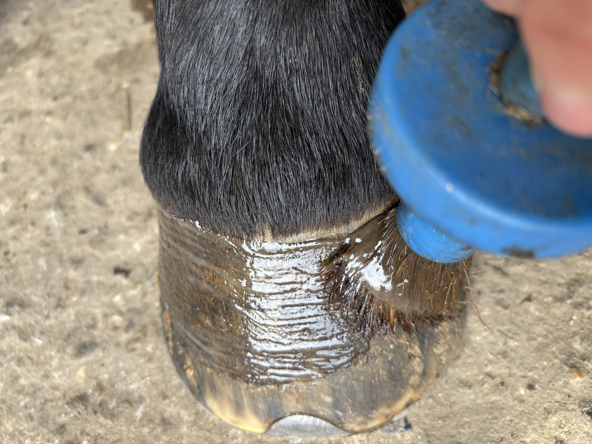 À l’application, l’onguent se révèle très agréable à utiliser. Sa texture est bien équilibrée : suffisamment épaisse pour ne pas couler du pinceau, tout en restant facile à étaler de manière homogène sur le sabot. Ce point rend l’application rapide et propre. Dès le lendemain de la première utilisation, l’aspect des pieds était visuellement positif.
